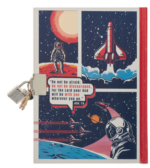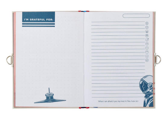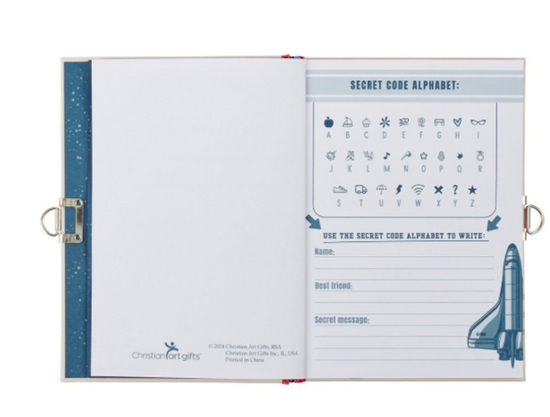 Un candado de plata con dos llaves está fijado al lateral del diario para proteger el contenido. El diario secreto de tapa dura tiene una página de presentación donde se puede agregar el nombre del propietario y una clave para un código secreto que el niño puede usar para codificar sus entradas. Hay 160 páginas con indicaciones, páginas para dibujar, objetivos, páginas con cuadrícula de puntos, un rastreador de gratitud, páginas para escribir en el diario y registros de oración, todo organizado por semana. Una cinta marcadora registrará su progreso y facilitará retomarlo donde lo dejó. El diario de tapa dura recorre diez versículos bíblicos impresos en la parte inferior de las páginas rayadas.