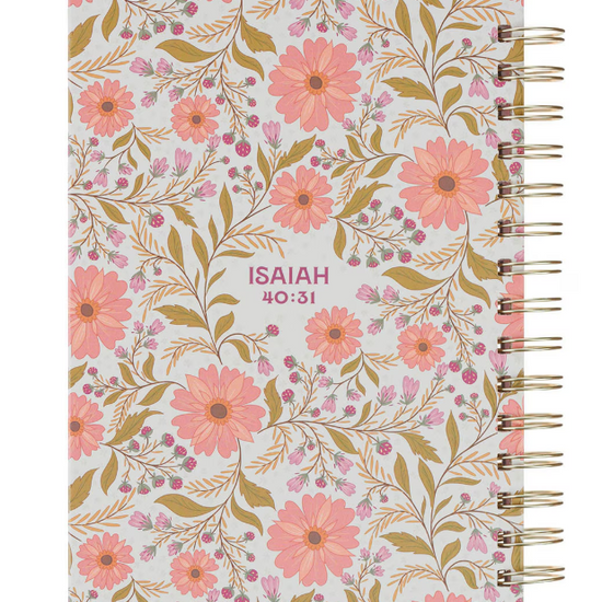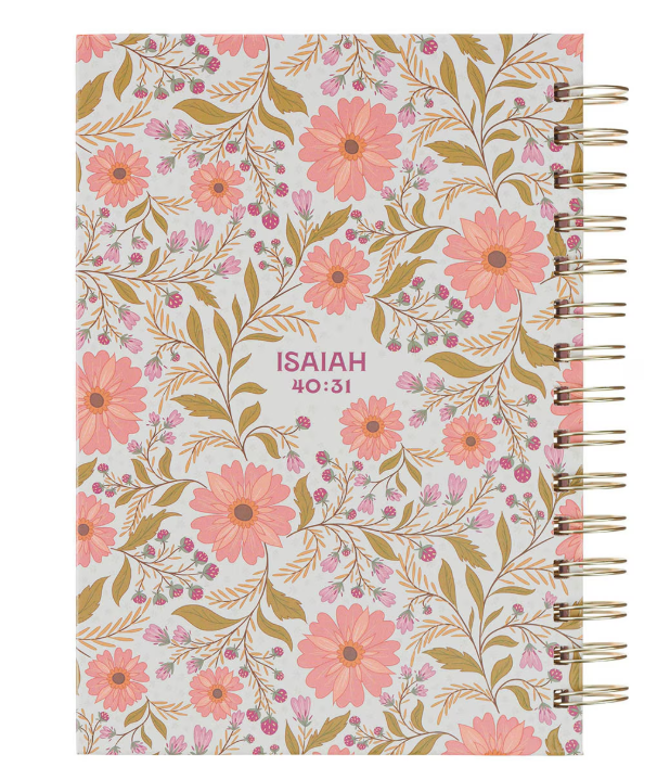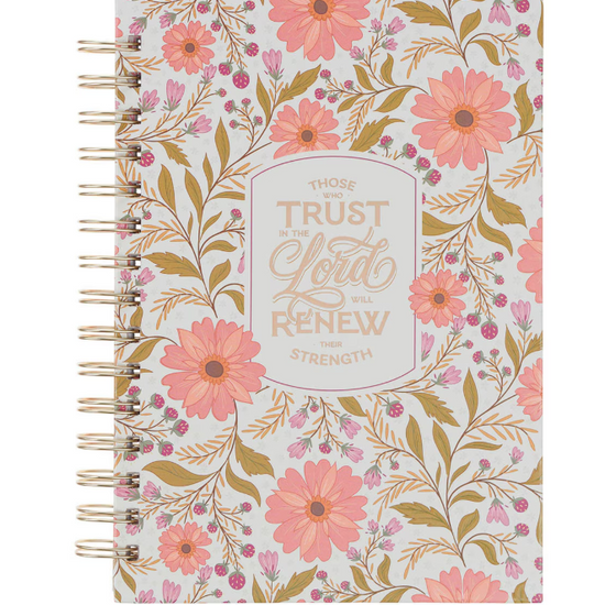 Trust Coral Floral Spiral Journal — Isaías 40:31 acompaña tu tiempo de oración y silencio, invitándote a renovar tus fuerzas mientras reflexionas, escribes y sueñas. Este cuaderno inspira a descansar en la promesa de Dios y a encontrar esperanza en cada palabra dedicada al Señor. Los que esperan en el Señor renovarán sus fuerzas.Isaías 40:31