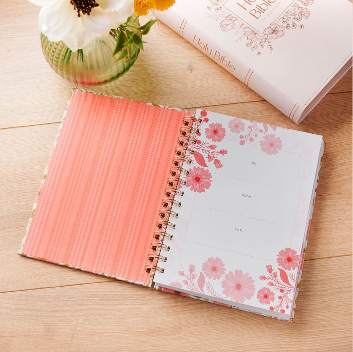 Su portada muestra un delicado arreglo de amapolas coral, bayas ciruela y hojas dorado-verdosas alrededor de un marco arqueado que enmarca un sentimiento de fe en letra elegante; en el reverso aparece la referencia bíblica como recordatorio constante. En el interior encontrarás espacios pensados para la personalización y la reflexión, decorados con pequeños ramilletes florales y versículos que invitan a la meditación y sirven como guía para orar o crear. Forma parte de la Trust Coral Cascade Collection, una línea diseñada para combinar en regalos significativos con piezas como llaveros, termos, tazas, velas y accesorios de devoción.