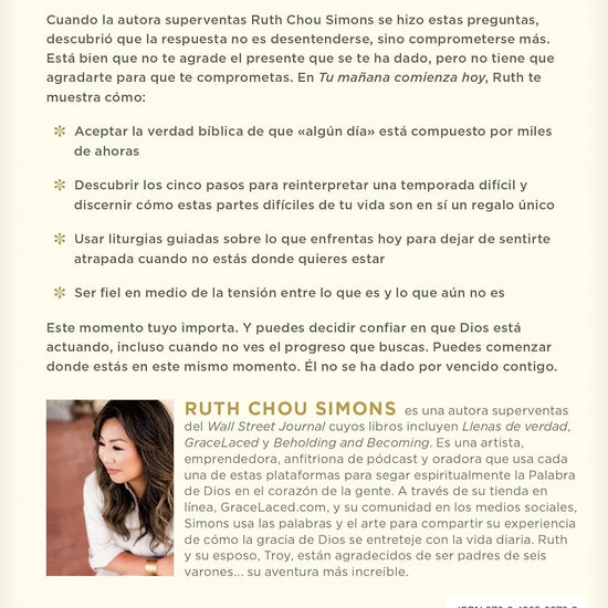 Tu mañana comienza hoy invita a reconocer con ternura que tu momento presente importa. Con una voz serena y valiente, Ruth Chou Simons acompaña a quien espera, anhela y ansía más, recordando que en la tensión entre lo que es y lo que aún no es podemos acercarnos a Dios y vivir con esperanza.